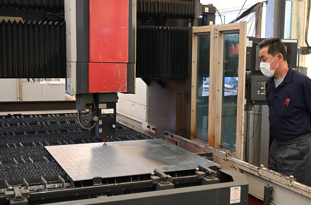 出来上がった設計図データを元に、鉄板をレーザーでカットしていきます。カット後、手作業で型抜きをします。